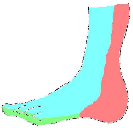 Cartoon depiction of the right foot viewed from the medial plantar surface. Corresponding territories are as follows: blue- anterior tibial artery, green- posterior tibial artery, red- peroneal artery.