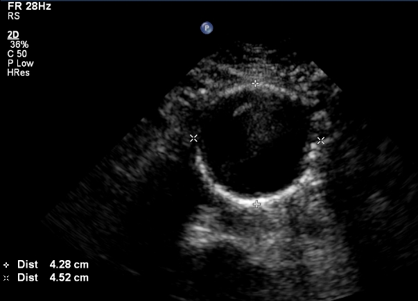 An aneurysm is an abnormal dilatation of a blood vessel that involves all three layers of the vessel wall (intima, media and adventitia). An aortic aneurysm is such a dilatation of the aorta and it is the most common form of aneurysm. The prevalence of an abdominal aortic aneurysm is 8% in persons over 65, more in men than in women. Identifying this dilatation is important because it may progress and cause blockage of blood supply to various organs (i.e. the kidneys and intestines), contain thrombus that might embolize to distal organs or burst and cause severe, often life threatening hemorrhage.