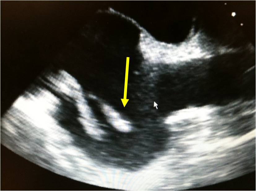 EKOS TM catheter seated in the right main pulmonary artery via the right femoral vein. The catheter segment between the yellow areas is the” treatment zone”, where thrombolytic agent is administered and ultrasound energy is emitted. The combined slow elution of TPA coupled with ultrasound energy is thought to accelerate thrombolysis by allowing deeper penetration of TPA into thrombus (Owens, Sem Interv Radiol 2008). To our knowledge, there are no published randomized data showing superior, non-surrogate clinical outcomes with EKOS compared to traditional infusion catheters. The ULTIMA trial first published after the 2013 ACC conference in San Fransisco was a randomized comparison of the EKOS catheter and anticoagulation for 59 patients with submassive pulmonary emboli. The study showed better 24 hour right ventricular size with the advanced therapy.