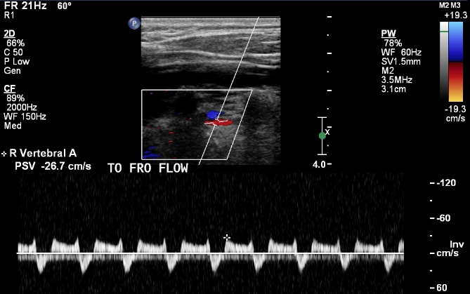 Some patients have “pre-steal”. If you scan them you will actually see normal, antegrade, flow in the vertebral artery. To produce the reverse flow you will need to increase flow in the arm. To see the reverse flow, the patient will need to use their arm. Another way is by inflating a blood pressure cuff and then deflating it. This causes reactive hyperemia. More blood flow goes to the arm and less to the brain. The following image shows the final stage of vertebral steal from severe right proximal subclavian artery stenosis: