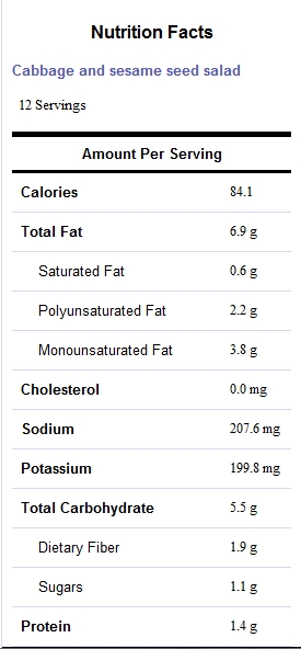 This cabbage salad can be a great supplement to any meal of eaten on its own. Remember portion sizes… Press on the nutritional label to enlarge:
