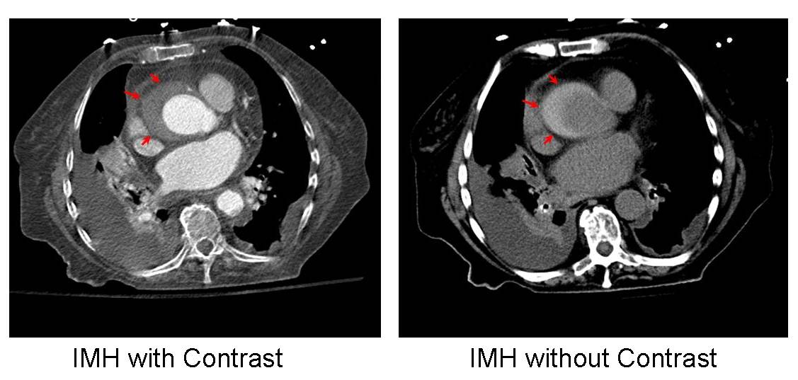 CT is the most common study to make the diagnosis. They are usually found incidentally. The CT should be performed without contrast and then with contrast. Intramural hematoma can actually be better visualized without contrast as blood is bright when the bleeding is acute. On the contrast exam, the hematoma may blend into the wall and seem like an atherosclerotic process.