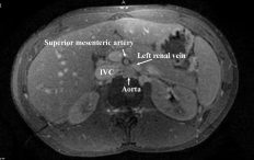 The diagnosis of nutcracker syndrome is often made with abdominal imaging. The typical finding is a left renal vein compressed between the aorta and the superior mesenteric artery. Other findings will be dilatation of the hilar portion of the left renal vein, dilatation of the left gonadal vein and abdominal varices. Ultrasound is often the first study to be utilized. As the flow limitations vary with patient position, it is important to document the position in which the study was performed. Also, it is useful to document flow in multiple positions. Nonetheless, computed tomography is the most commonly utilized technique. MRI can also offer great images as can be seen in the following image: