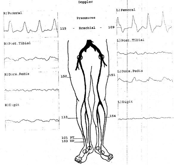 A 71-year-old gentleman with diabetes, coronary artery disease status post CABG and chronic renal failure on hemodialysis presented in clinic complaining of bilateral foot pain at rest for six months. Recently he noticed the toes on his left foot becoming discolored. One year ago he was able to go on the walking paths around his home, but currently is housebound because of debilitating foot pain.