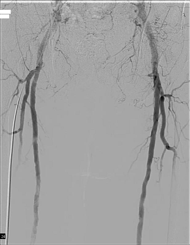 Angiography revealed bilateral occlusions of the anterior and posterior tibial arteries. Iliac and femoral arteries were free of significant disease (Figure 1):