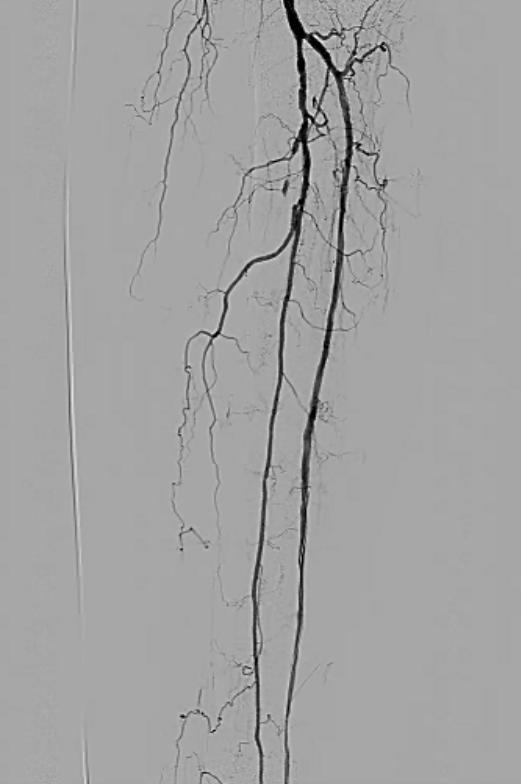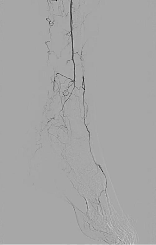 Angioplasty of the left tibial arteries was performed for limb salvage. With support from a 6F 65 cm sheath via the right common femoral artery, a 3×20 mm balloon was used for angioplasty of the left tibioperoneal trunk. A 0.018 inch Confianza Pro 12 wire (Abbott Vascular, Abbott Park, IL) and support catheter was used to cross the occluded anterior tibial artery, which was then angioplastied with multiple inflations of a 3×100 mm balloon, producing a good result (Figure 4):