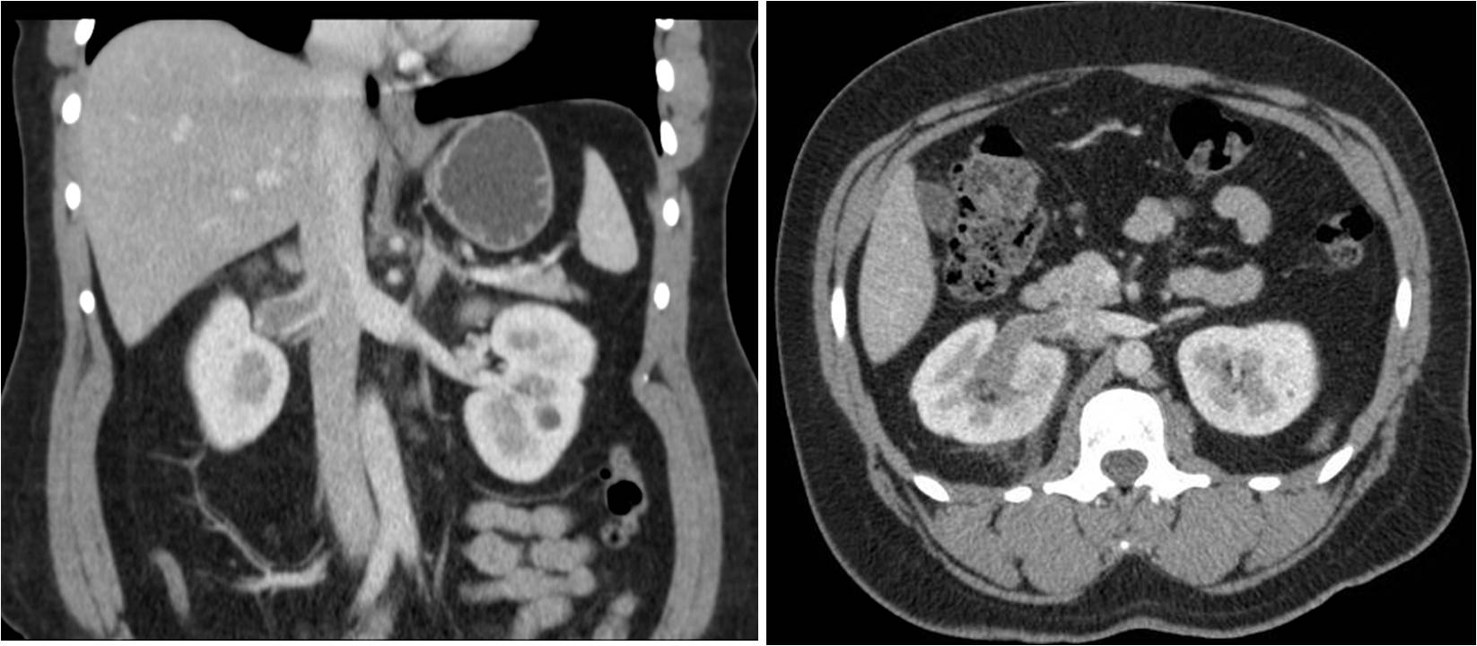 Renal vein thrombosis should be suspected in patients with flank pain and hematuria, especially if accompanied by impaired renal function. The best imaging studies to make the diagnosis are computed tomography (as seen above) or magnetic resonance imaging. On imaging a filling defect will be seen within the renal vein. The filling defect may extend into the inferior vena cava. The kidney itself may show a renal cell carcinoma or edema from congestion. Theoretically renal duplex ultrasound will show lack of flow within the renal vein, however this is not a reliable test for this diagnosis. If you cannot identify normal flow, but you still suspect the diagnosis, you should opt for another imaging modality.