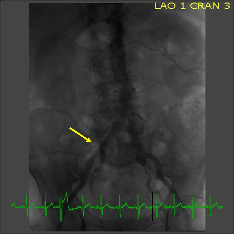 The selection of a bare metal stent avoided jeopardizing the ipsilateral internal iliac artery. Since the lesion did not encroach upon the distal external iliac-common femoral artery junction, a compelling indication for a self-expanding stent was not present. Fortunately, the patient’s claudication symptoms resolved, and he is clinically well 6 months later.