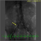 An eccentric, calcified lesion with associated 40 mm Hg pressure gradient is present (yellow arrow).