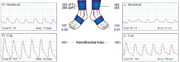 Then the toe pressures are measured. A ratio is calculated between the toe pressure and the higher brachial pressure. In this example the ankle brachial index could not be interpreted. NC means ‘Non-Compressible’: