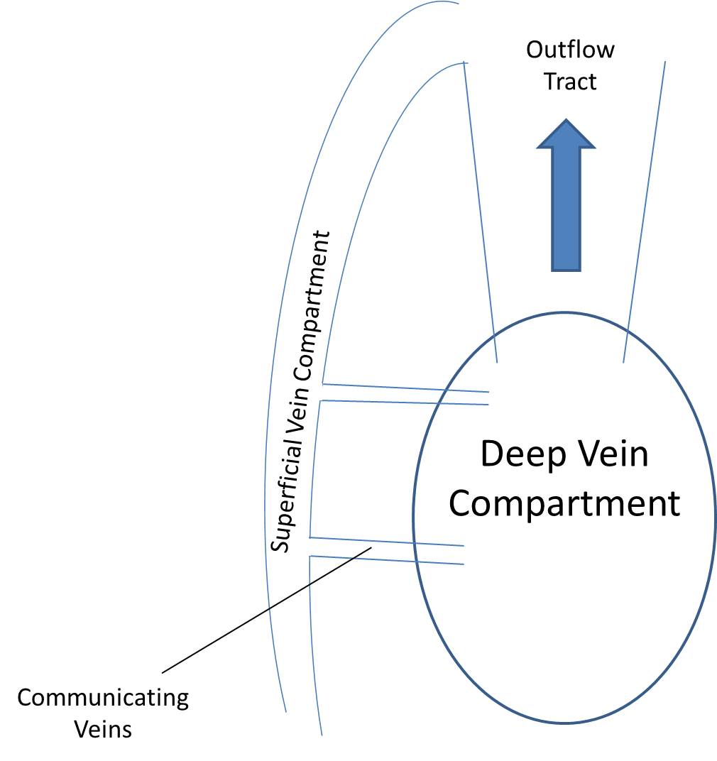 • As a consequence of deep vein thrombosis the uni-directional valves are destroyed and flow increases in the superficial system.  This, in turn, causes elevated venous pressure and varicose veins.